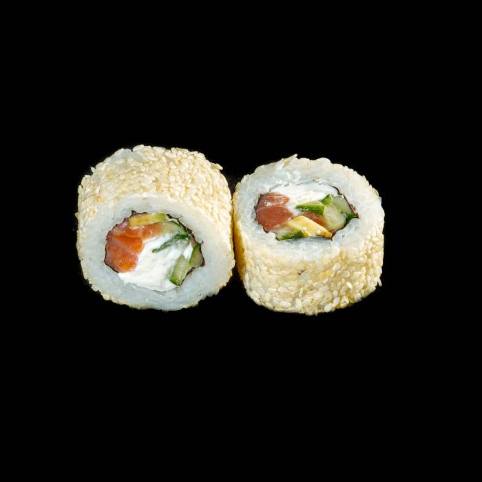 Рис, нори, сливочный сыр, лосось, авокадо, огурец, кунжут.