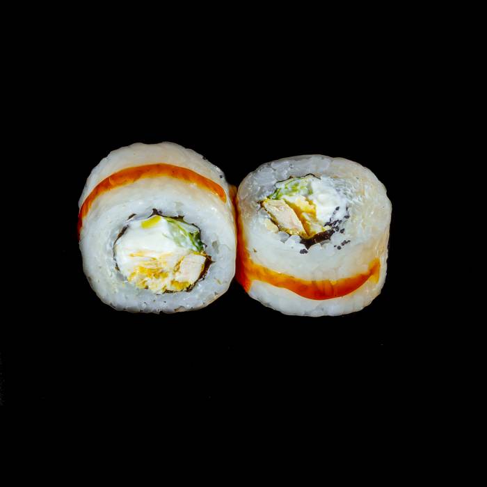 Рис, соевая бумага, куриное филе, сливочный сыр, салатные листья, унаги соус.