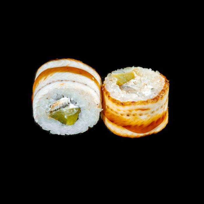 Рис, жареный угорь, сливочный сыр, дайкон, угорь, нори.
