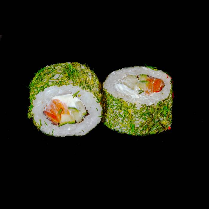 Рис, лосось, огурец, сливочный сыр, укроп, нори.