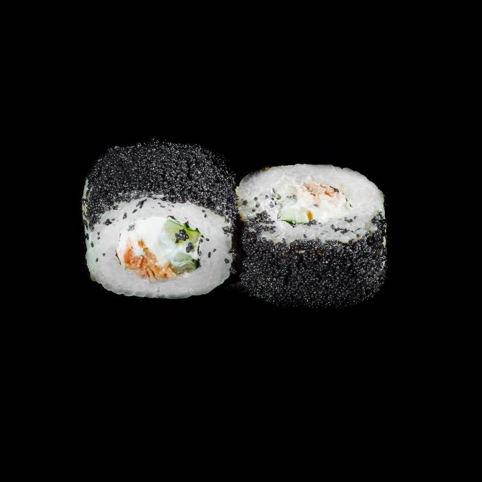 Рис, жареный лосось, сливочный сыр, огурец, икра масаго, нори.
