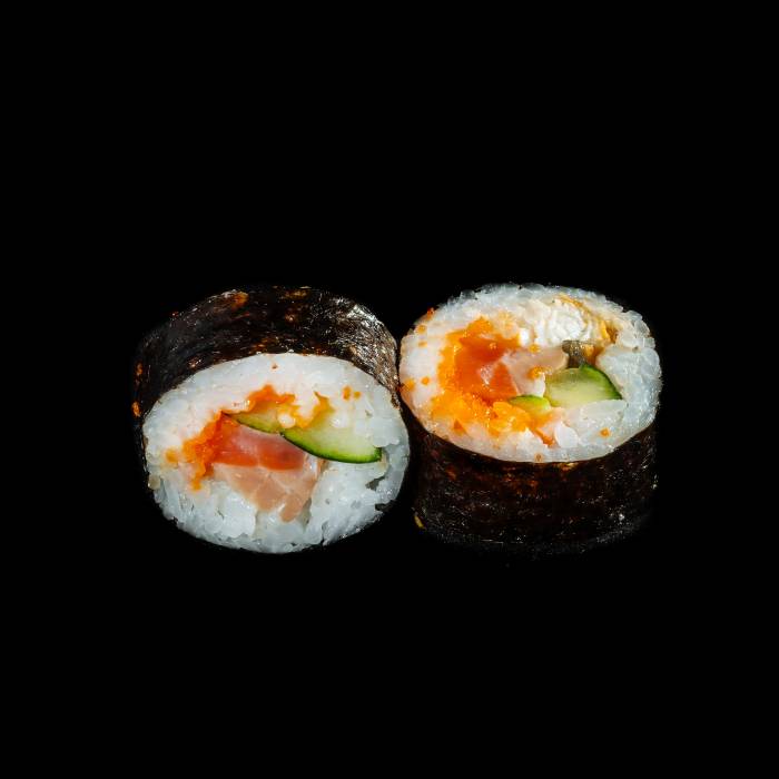 Рис, лосось, угорь, огурец, икра тобико, нори.