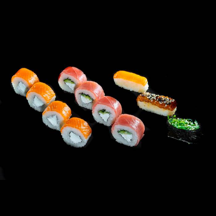 Ролл «Филадельфия классическая» - 4 шт, Ролл «Филадельфия с тунцом» - 4 шт, Сяке - 1 шт, Унаги - 1 шт, Чука - 1 шт.