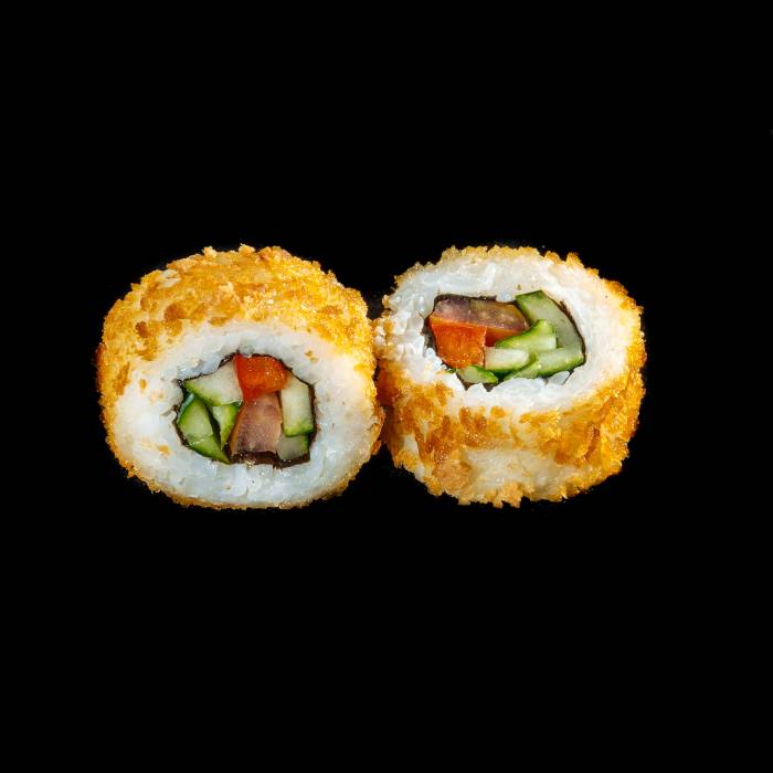 Рис, огурец, томаты свежие, перец сладкий, кунжут, майонез, кляр, сухари, нори.