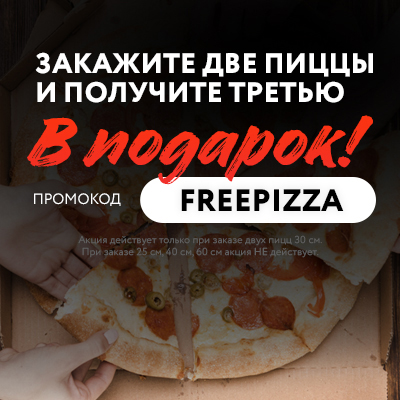 Акция 2 пиццы + 3 в подарок, действует только при заказе двух пицц 30 см. При заказе 25 см, 40 см, 60 см акция НЕ действует.
